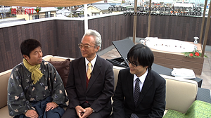 戻ってきました屋上のもう一つのリビング。 佐々木社長も加わって、3人でゆったりくつろぎ! いよいよ気になるお値段の発表です! 屋上庭園・ジャグジー付き35坪で、驚きの1703万円!! 坪数で金額が決まっていて、35坪だと1603万円、屋上庭園・ジャグジーが100万円だとか!